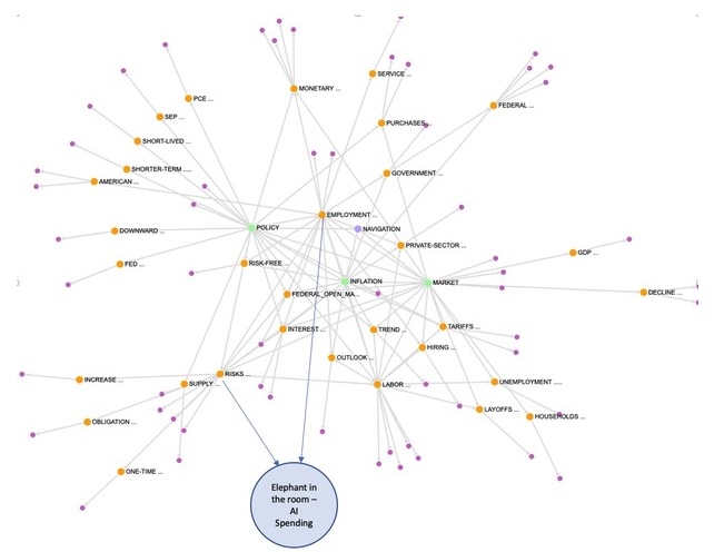 Three of the four child nodes, "policy", '"inflation", and "market" are represented with green color. However, "employment" is represented by an orange node. This tells us that "policy", "inflation" and "market" are independent stories while "employment" is a supporting story. From semantics point of view, "employment" is a consequence of "policy", "inflation", and "market". As such, it is a key deciding factor on FOMC's decision to cut rate. It leaves inflation to settle on its own while putting priority to enable a moment of QE or looser money policy.